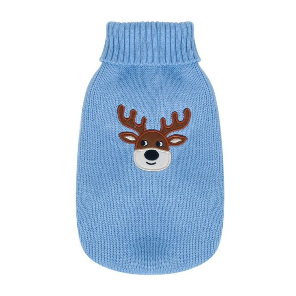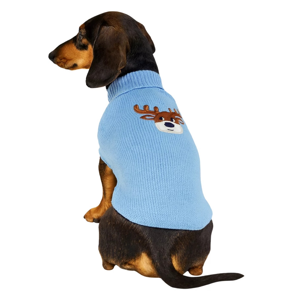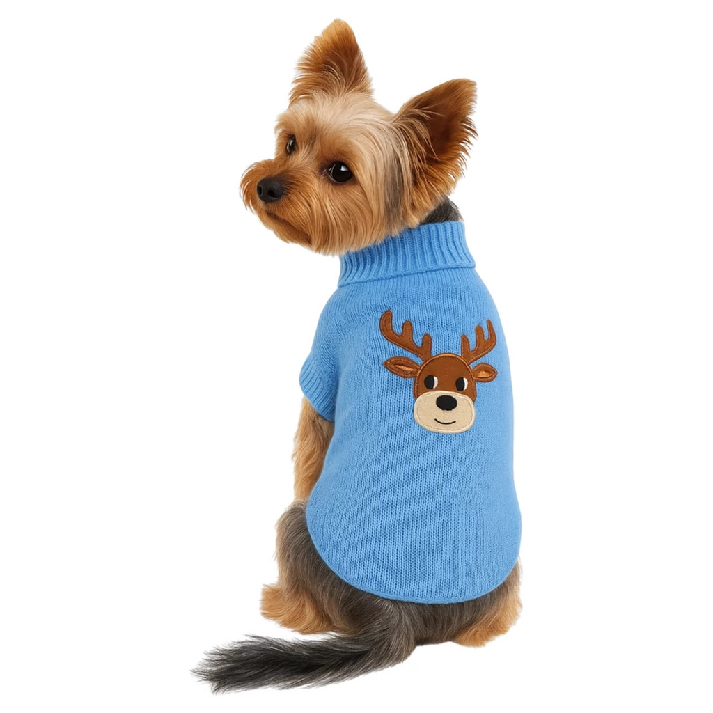 Karácsonyi kötött kutyapulóver rénszarvas mintával, világoskék, M-es méretben.